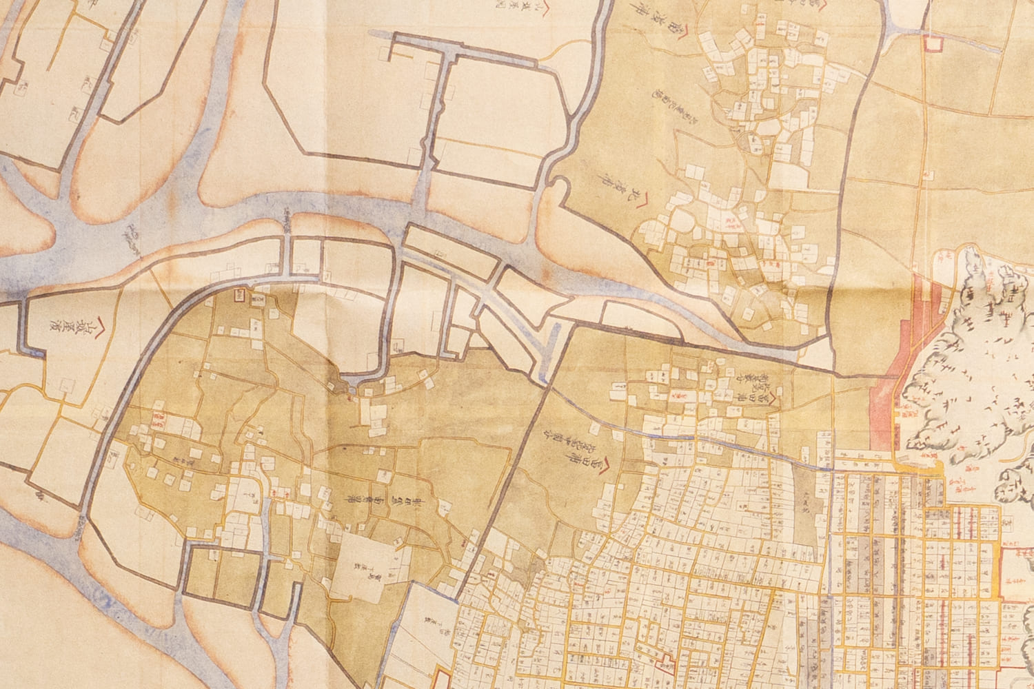 蜂須賀氏の阿波徳島城下を描いた復刻絵図。吉野川河口の三角州に発達した「水の都」の、水路と橋が織りなす景観を再現。