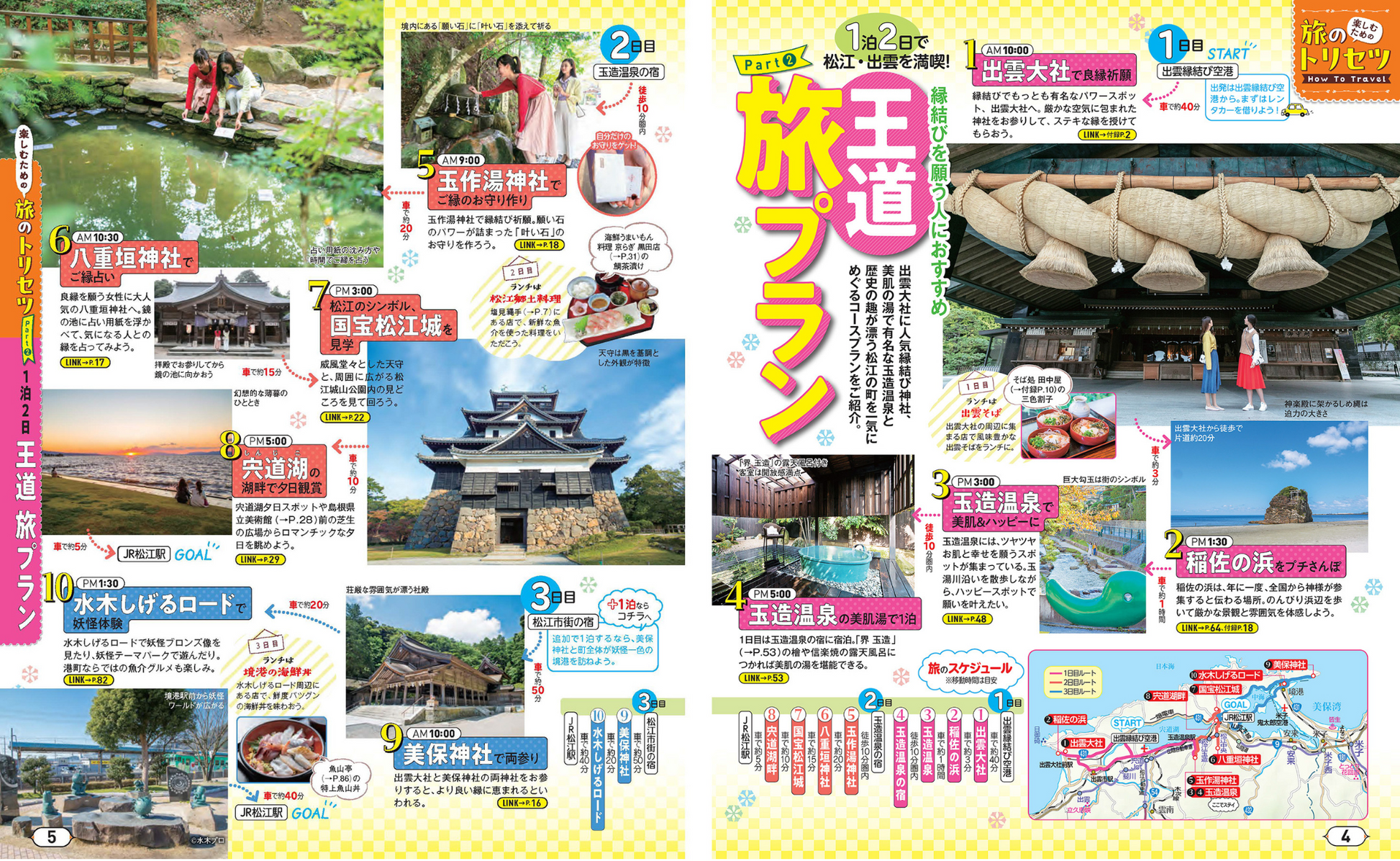 そのほかに、松江城、足立美術館、水木しげるロード、石見銀山などの必見スポットを詳細ナビゲート。美肌温泉やご当地グルメ、おみやげ情報も満載です。