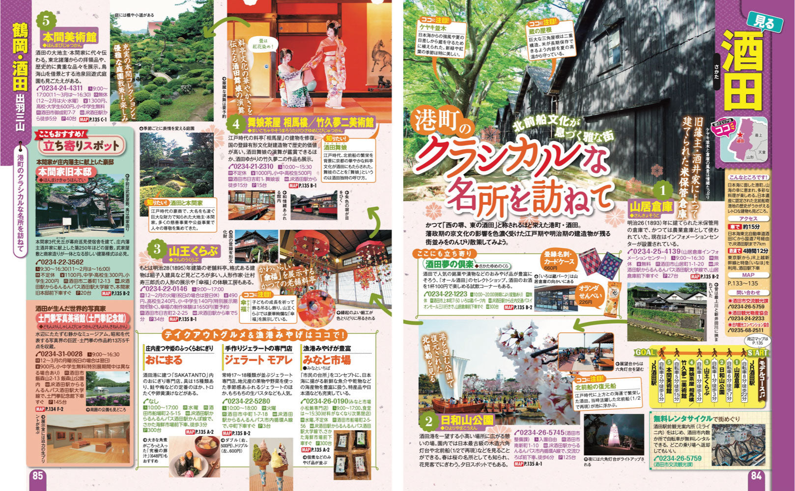 鶴岡/酒田/出羽三山/鳥海山/湯野浜温泉/あつみ温泉/湯田川温泉/ 山形タウン/蔵王/山寺/天童/かみのやま温泉/東根/村山/寒河江/ 銀山温泉/肘折温泉/最上/新庄/大石田/尾花沢/米沢/高畠/赤湯温泉/白鷹/長井