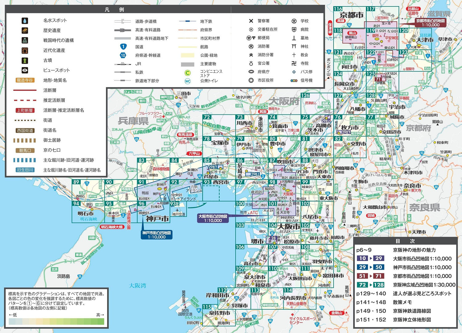 大阪・神戸・京都エリアの地形を精密に表現した地図。見て楽しむもよし、本書を持って地形を楽しむ散歩に出かけるもよし。