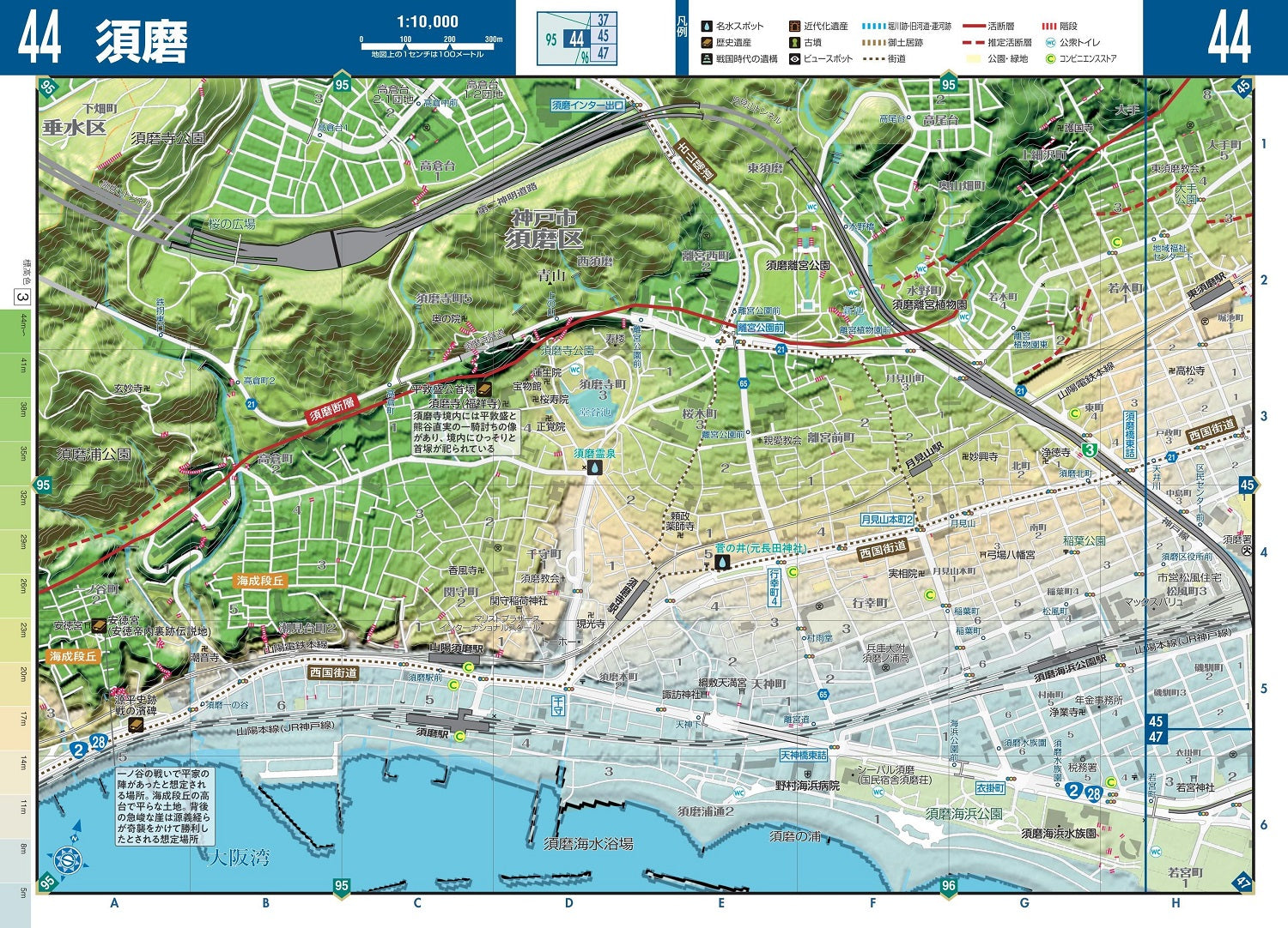 これまで地図上でのリアルな表現が難しかった高低差のある地形を1万分の1および3万分の1の縮尺で精密に表現。大阪・神戸・京都エリアの丘陵地、台地、低地、海岸線が入り組んだ複雑な地形が手に取るようにわかる画期的な地図です。
