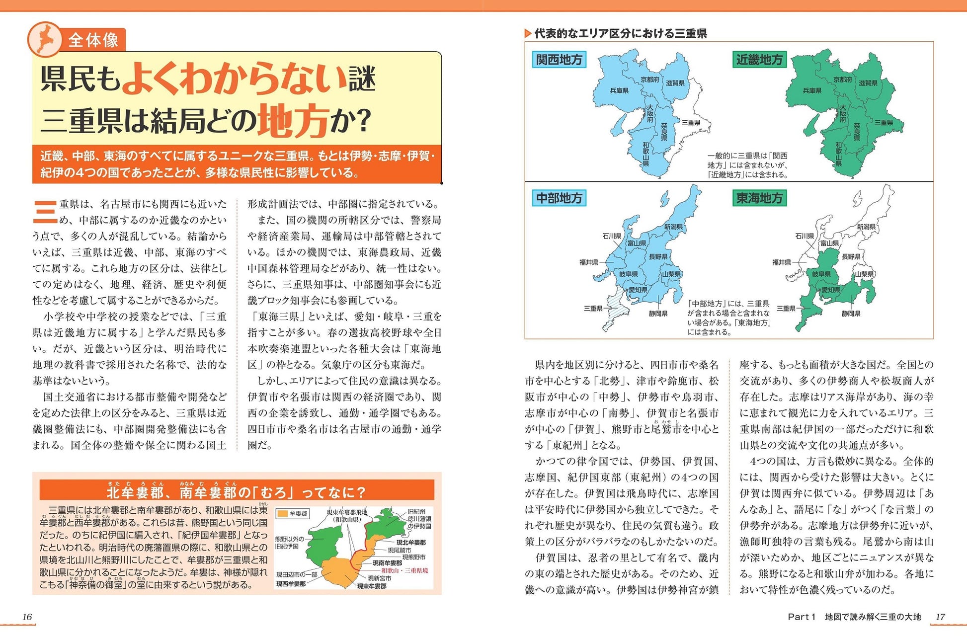 県民もよくわからない謎 三重県は結局どの地方か?/三重県を横切る中央構造線 南北で大きく異なる地質/琵琶湖は伊賀にあった! 古代の地殻変動の痕跡を探る/赤目四十八滝の独特な地形と生きた化石オオサンショウウオ/鳥瞰図で見る 昭和初期の赤目四十八滝と香落渓/2万年前は山だった? 志摩半島誕生の秘密/若き日の大正天皇も泳いだ! 日本初の海水浴場二見浦/奥伊勢の香肌峡の不思議 なぜ超硬水が湧き出す?/飛び地と名勝瀞八丁が複雑すぎる3県境をつくった/伊勢湾台風のせいで飛び地に? 愛知県に限りなく近い木曽岬町/世界遺産鬼ヶ城を生んだ巨大な熊野カルデラ火山/尾鷲の雨量が尋常でないのは海流と大台ヶ原のせい?…などなど三重のダイナミックな自然のポイントを解説。