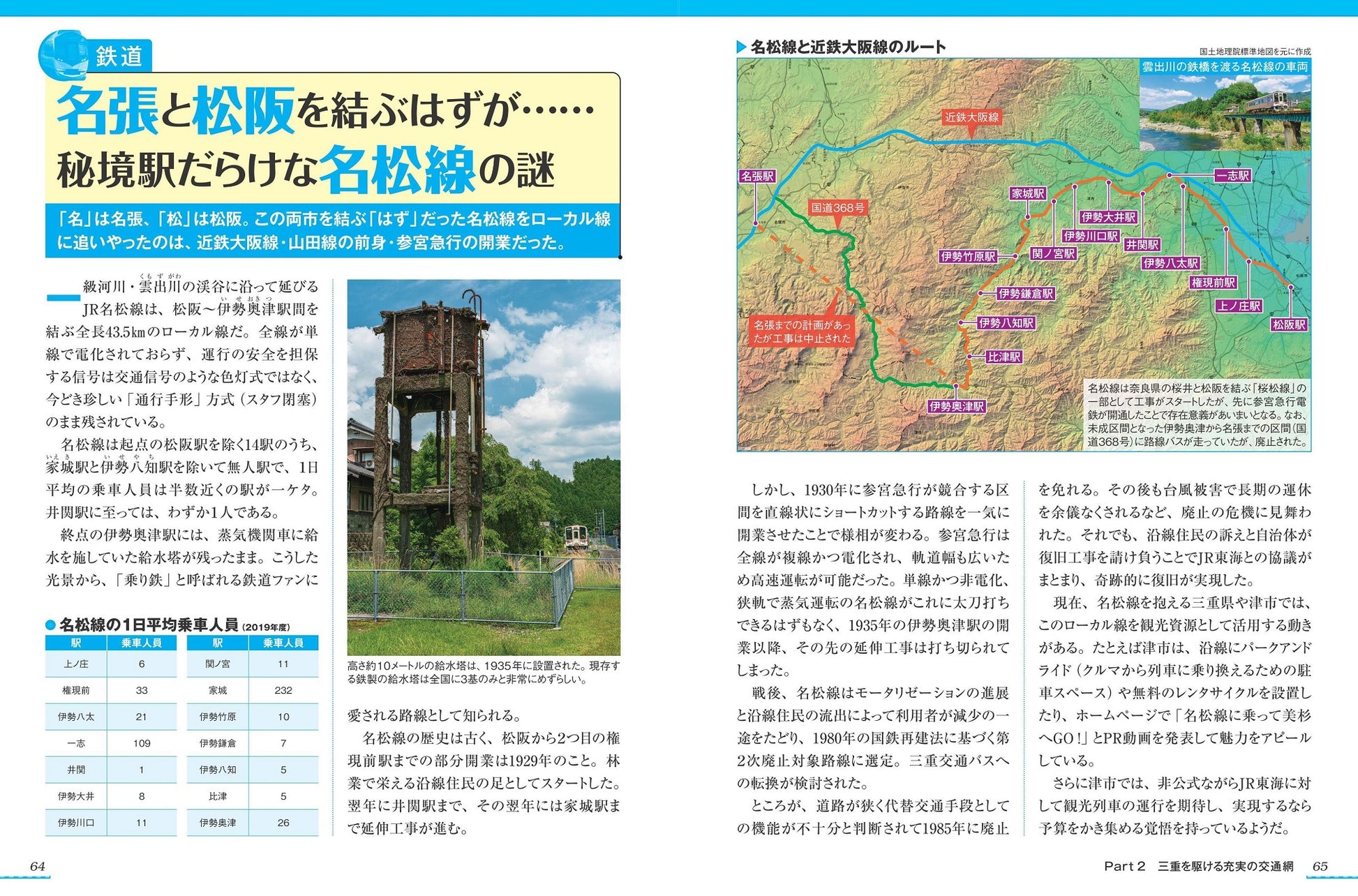 伊勢湾を渡って川を越え鈴鹿峠へと向かう東海道/三重と浜松、大阪がつながる!? 太平洋新国土軸構想とは/御師の活躍で大いに賑わった内宮と外宮を結ぶ参宮街道/鳥瞰図で見る 吉田初三郎が描いた約90年前の参宮街道/初瀬街道の「あお」越えと便利な参詣システム伊勢講/街道に餅が並んだ理由は? 吉野へと続く鯖&塩街道/参拝客を運んだ神都線の路面電車 バス路線網で車両が復活!?/伊勢湾、熊野灘の海運と海上の百貨店赤須賀船/峠が多い熊野古道伊勢路 戦前にはロープウェイがあった/つながった南紀への路線 紀勢本線の難工事とは?/名張と松阪を結ぶはずが……秘境駅だらけな名松線の謎/東大卒の剛腕社長による英断!? 近鉄を発展させた軌間拡幅工事/社名がコロコロ変わる養老鉄道 いま何代目? どこが運営?/貨物輸送の歴史がわかる三岐線の貨物鉄道博物館/片道135㎞の路線もある! バス中心の三重の交通網…などなど三重ならではの鉄道事情を網羅。