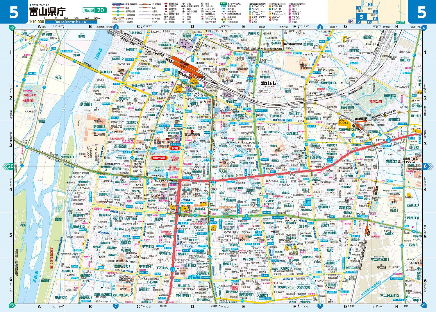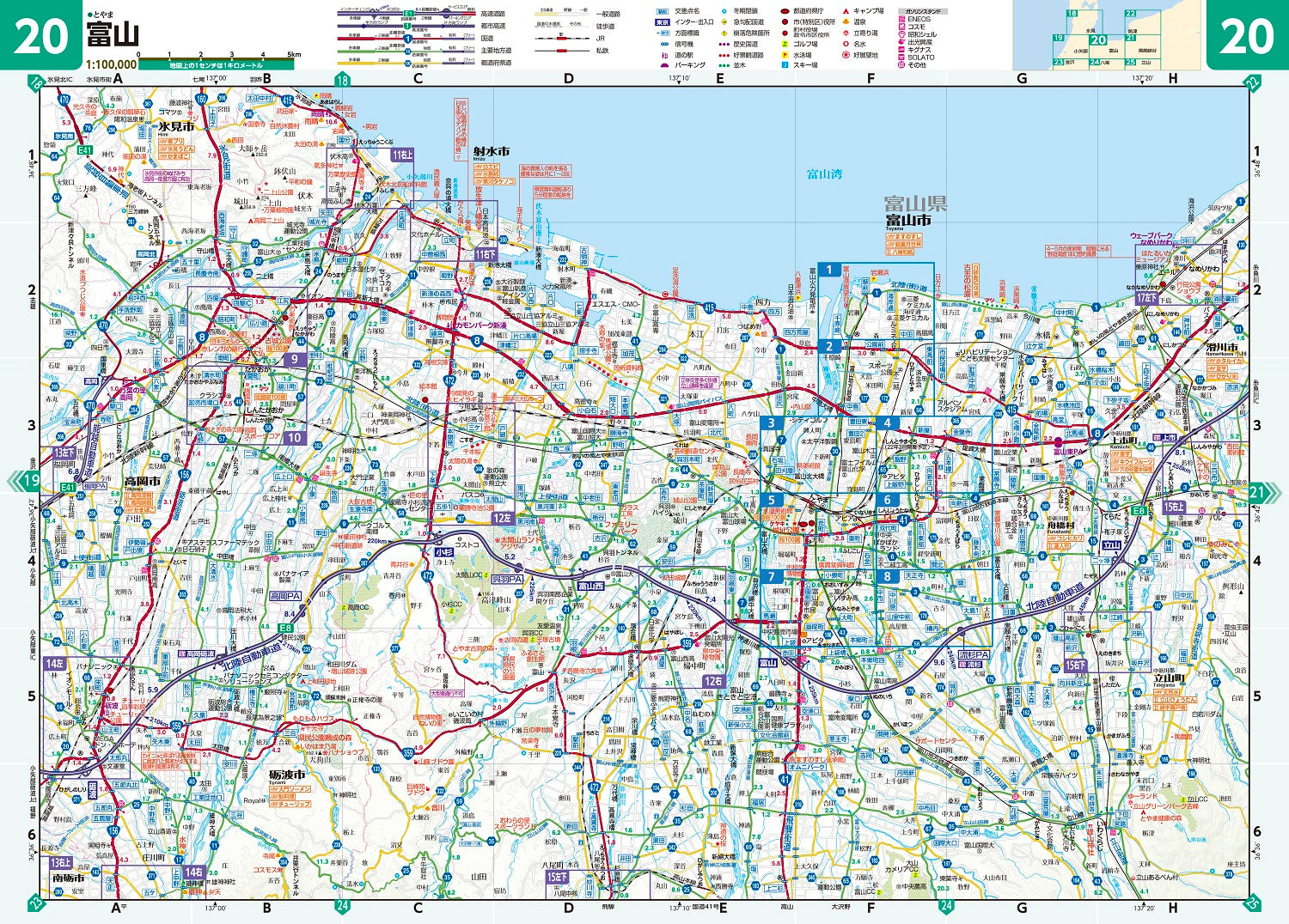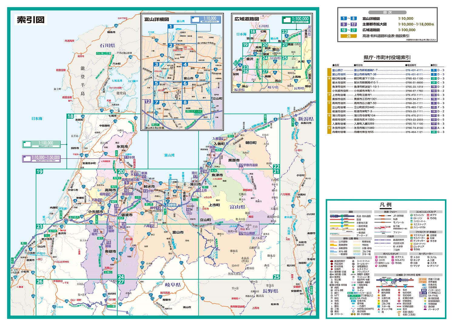 富山詳細図1:10,000、主要都市拡大図1:10,000~1:18,000ほか、広域道路図1:100,000