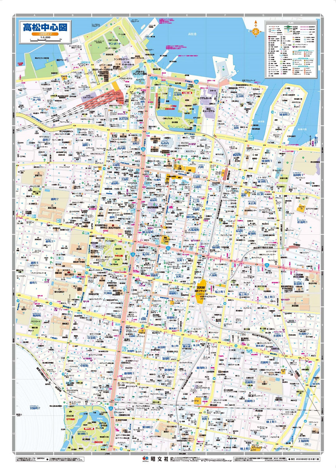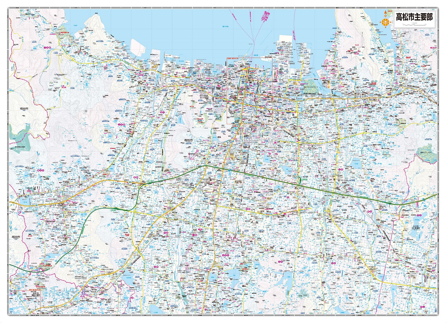 高松市、三木町、綾川町、小豆島町、土庄町、直島町の全域を1:35,000図と1:52,000図で、高松市の主要部および各町の中心部をより詳しい1:18,000図と1:25,000図で収録しています。さらに高松駅周辺エリアの詳細マップを1:5,000図で収録しています。付録にて町名索引と施設索引を収録し、役所、官公署、公共施設、学校などの検索に便利です。