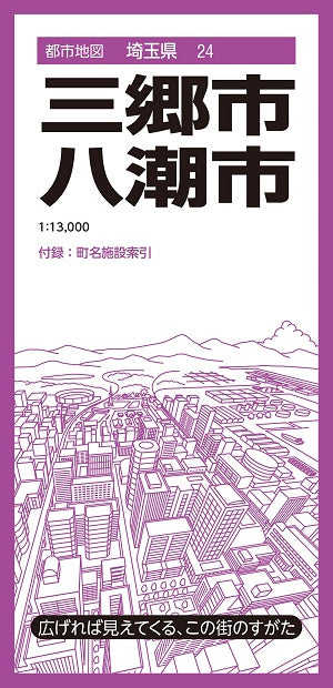 三郷市、八潮市の全域を本図1:13,000図で収録しています。裏面は書き込んで使える白地図となっています。付録にて町名及び市役所や官公署ほか生活に便利な施設の索引を掲載しています。