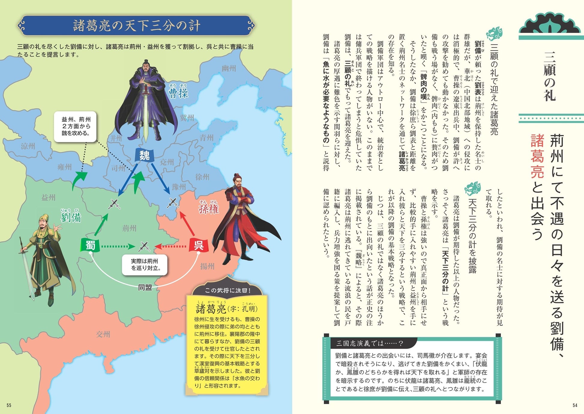 数多の武将たちが群雄割拠し、栄枯盛衰の理のもとに散っていった三国志。はるか昔の、しかも他国の歴史であるにも関わらず、日本ではマンガやゲームなど多くの作品の題材となり、どの世代も魅了している。本書では、三国志のなかでも重要な出来事や戦いを図説。なぜその土地が重要だったのか?その戦いがなぜそこで起こったのか?地図とともにみれば、三国志の本当の姿が見えてくる。また、正史としての三国志と、物語としての三国演義の比較、マンガや映画など人気作品を分析したコラムも三国志ファン必見!
