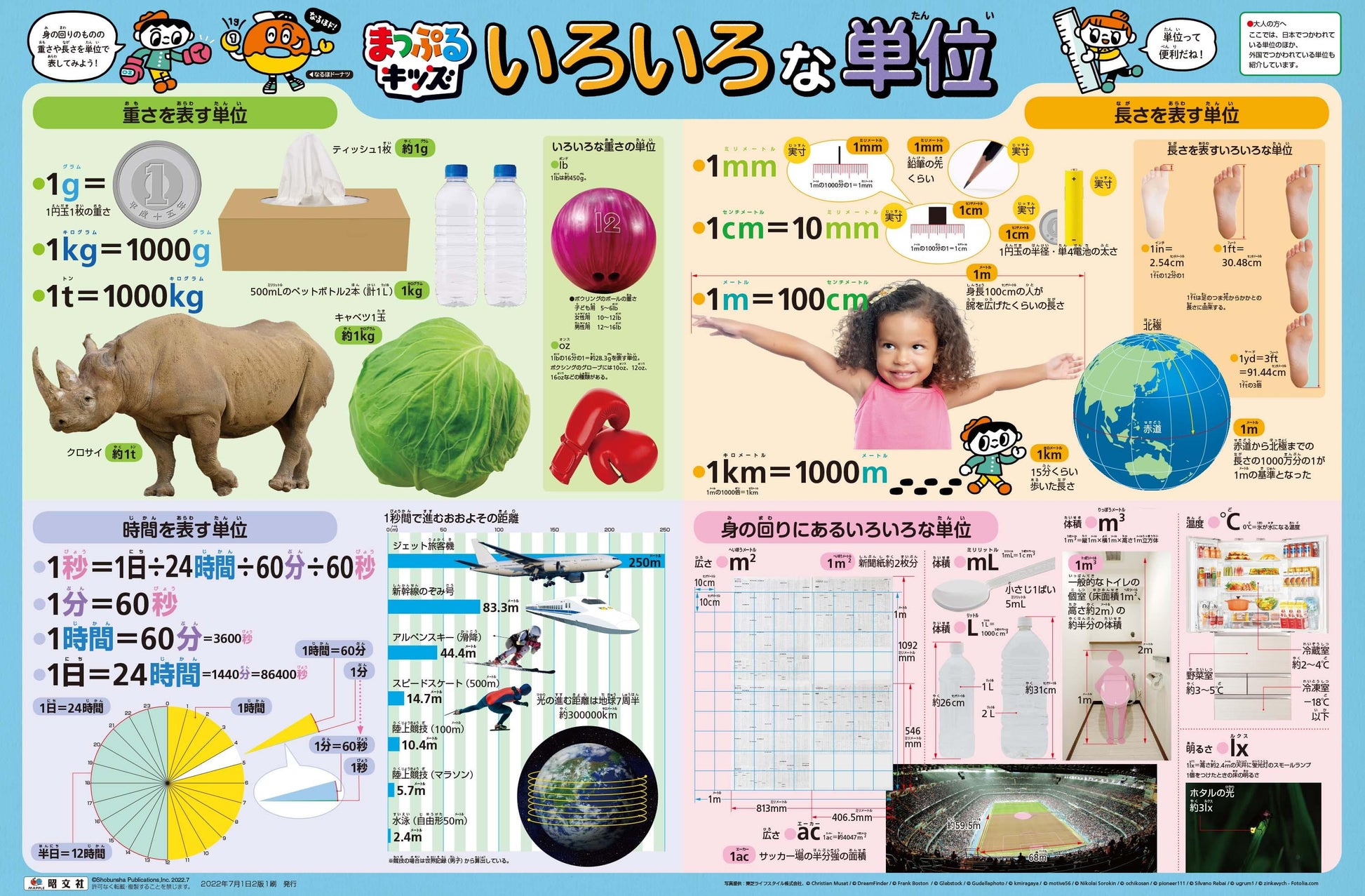 「重さ」「長さ」「時間」、そのほか身の回りにあるいろいろな単位を、身近な例とともに紹介しています。