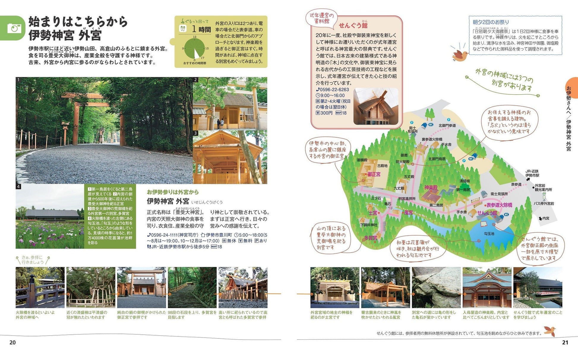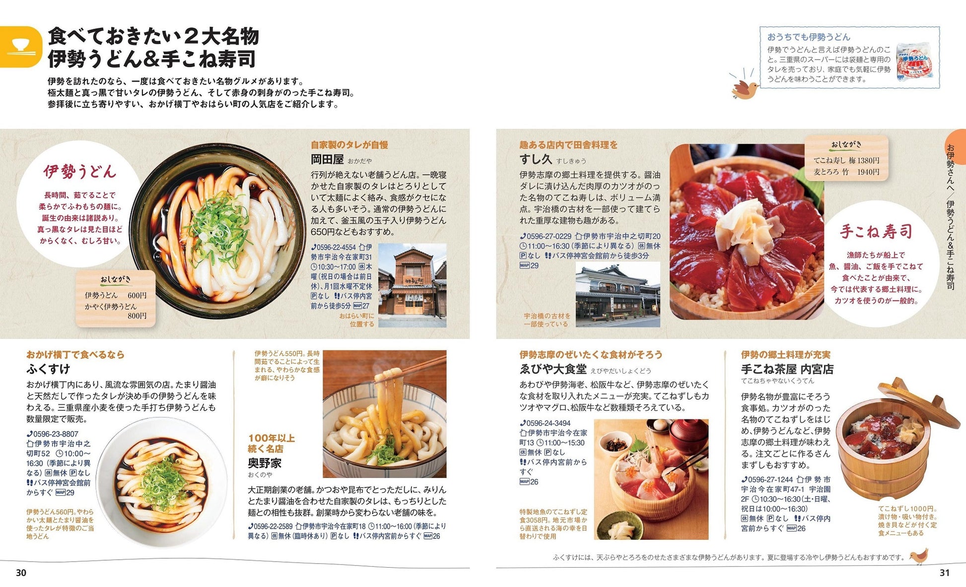 伊勢神宮 外宮・内宮の参拝に、おはらい町やおかげ横丁のそぞろ歩きなどのほか、名物の伊勢うどん&手こね寿司やほっこりカフェ、レトロでかわいい和雑貨など、押さえておきたい情報をしっかりと紹介。さらに蔵の街・伊勢河崎や二見エリアも収録。