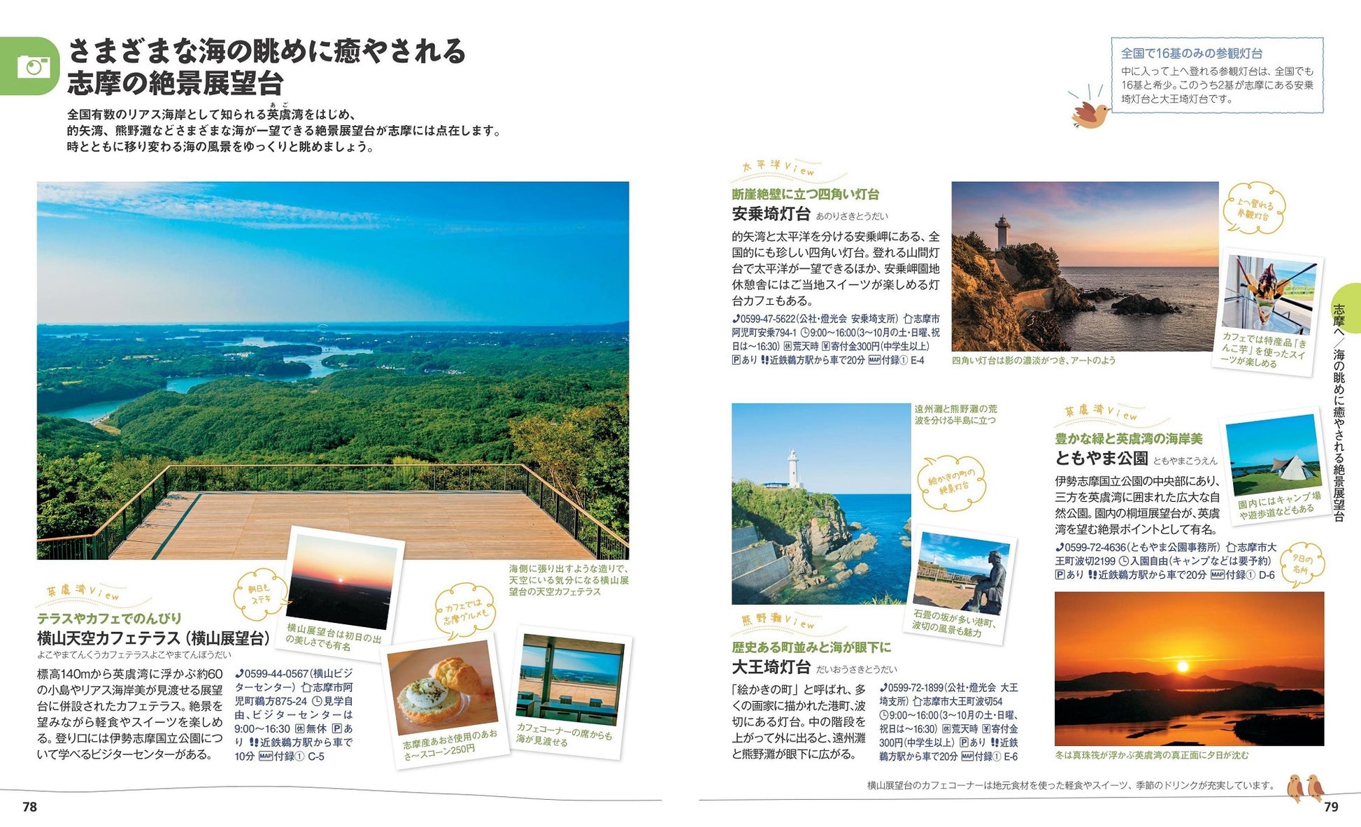 海の眺めに癒される絶景展望台のほか、海辺のやすらぎカフェやランチ、志摩ならではのグルメ&おみやげ、おしゃれなグランピング施設などを紹介。