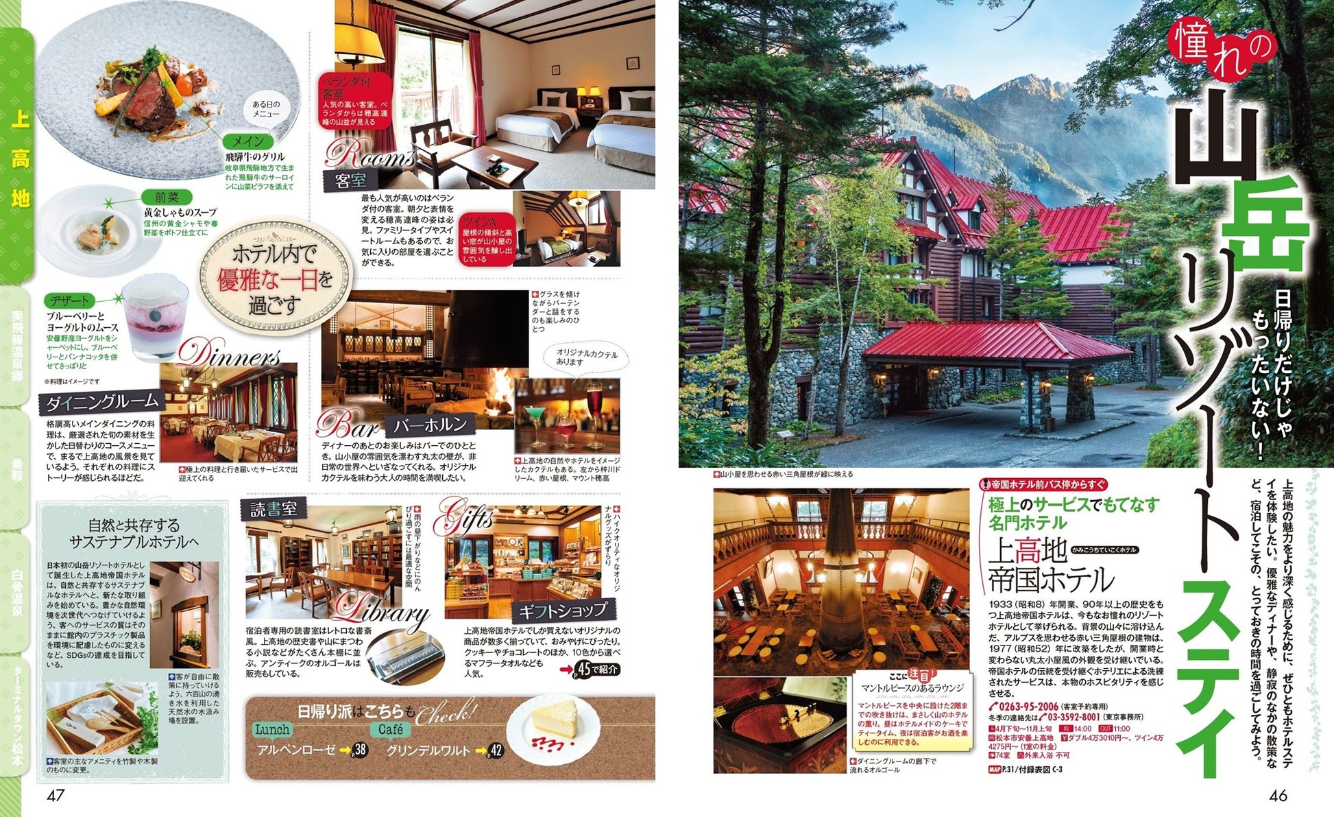 憧れの山岳リゾート上高地をハイキングするための情報が詰まった1冊。心ときめく絶景スポットやマイカー規制情報などのアクセス、シーズン早わかり、ウェアなどの装備、半日・1泊・2泊で旅するためのモデルプランなどを詳細に紹介。上高地からひと足のばして訪れたい、奥飛騨温泉郷の野趣あふれる温泉、乗鞍岳や乗鞍高原のアクティビティ、乳白色の湯・白骨温泉、ターミナルタウン松本などの情報も満載。