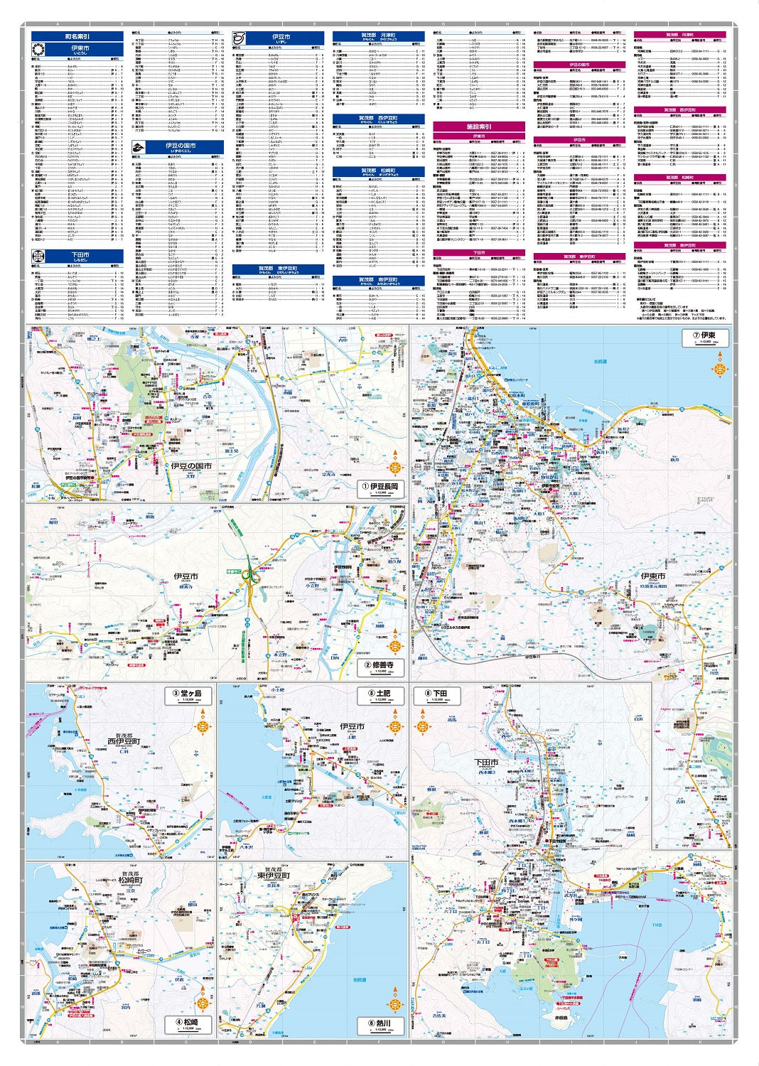 伊東市、下田市、伊豆の国市、伊豆市、東伊豆町、河津町、西伊豆町、松崎町、南伊豆町を含めた伊豆半島を1:66,000図で、各市町の中心部をより詳しい1:12,000図で収録しています。裏面には町名索引と施設索引を収録し、役所、官公署、公共施設、観光地などの検索に便利です。