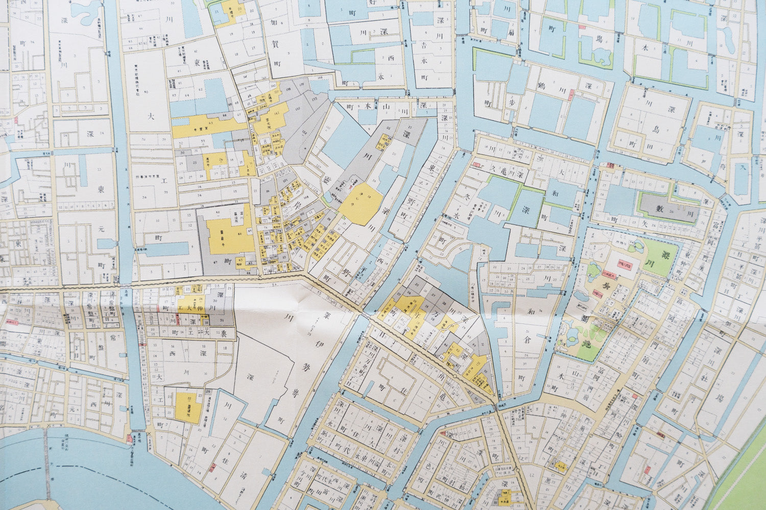 本商品の最大の特徴は、単なる地図ではなく「番地入(ばんちいり)」であること。当時の深川區のほぼ全ての番地が、克明に記されています。